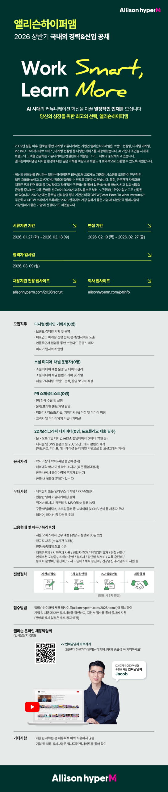 - PR 스페셜리스트 – PR 전략 수립 및 실행 / 온&오프라인 홍보 채널 발굴 / 고객사 및 미디어와의 커뮤니케이션 등